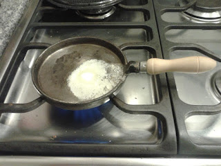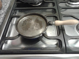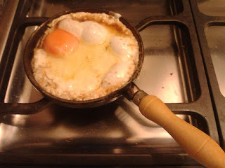 Fuego en mínimo, una vez caliente agregás un toque de manteca, distribuís, ponés el huevo, distribuís la clara, y lo dejás un paz un par de minutos o tres. Si tu fuego mínimo no es tan mínimo, cada tanto la sacás de fuego, ya que el hierro fundido tira un toco.